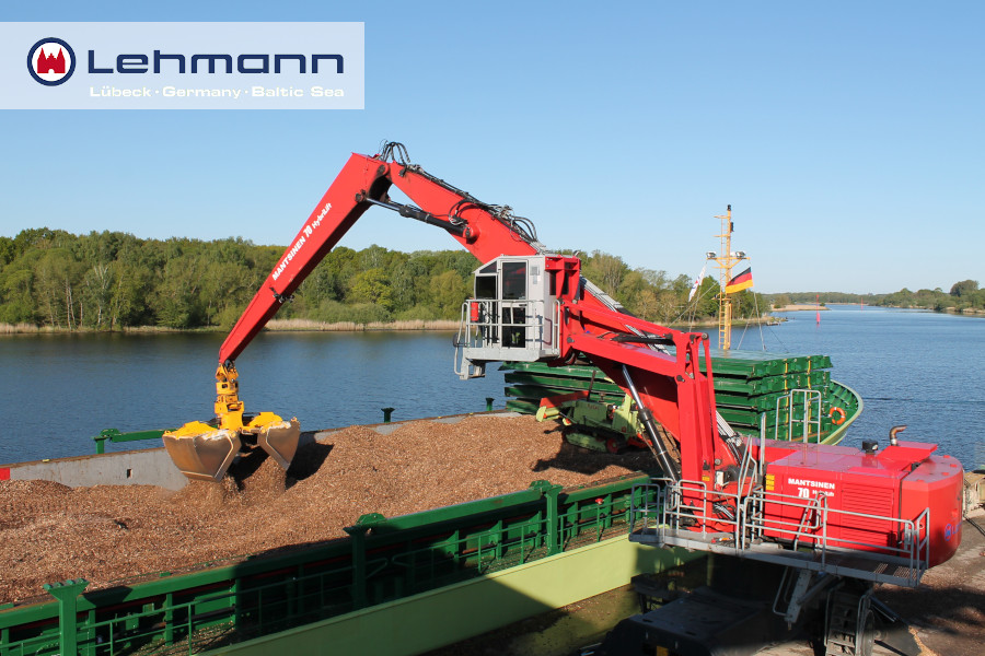 Unser Mantsinen 70 M HybriLift belädt zusammen mit seinem großem Bruder (Modell 160) seit gestern am Lehmannkai 1 unsere MS Ina Lehmann mit Holzhackschnitzeln für den Weitertransport nach Kopenhagen.