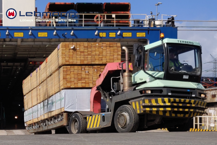 Heute gucken wir uns das Ganze mal von unten an. In diesem Bild ist zu sehen wie ein mit Schnittholz beladener Rolltrailer mit einer Terminalzugmaschine von Bord einer RoRo-Fähre gezogen wird. Dies gehört zu unseren leichtesten Aufgaben.